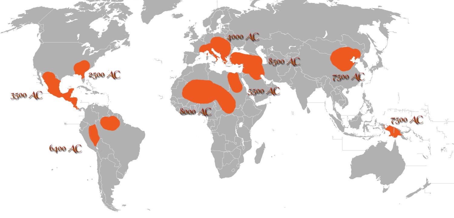 Desde el -10000 hasta el -6000 se empieza la transición desde el paleolítico al neolítico, los signos del sedentarismo como la agricultura y la ganadería aparecen en lugares del planeta muy alejados como la india, Mesopotamia, China y América.